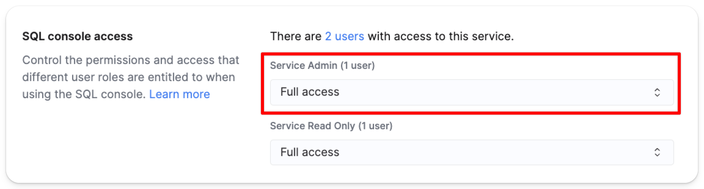 From the services page, click the menu in the top right corner of the service for which you want to adjust SQL console access settings.